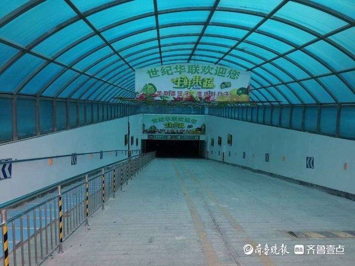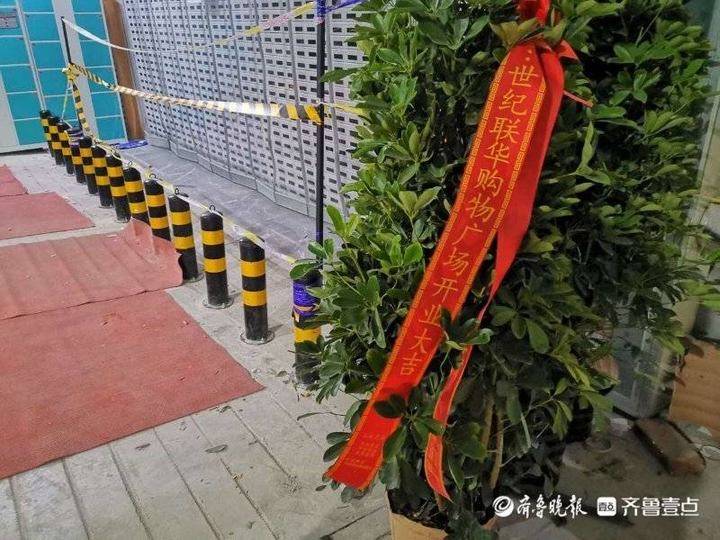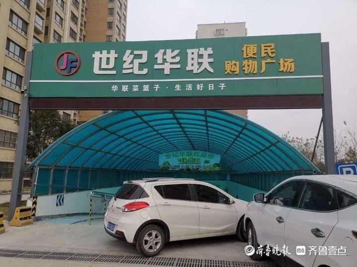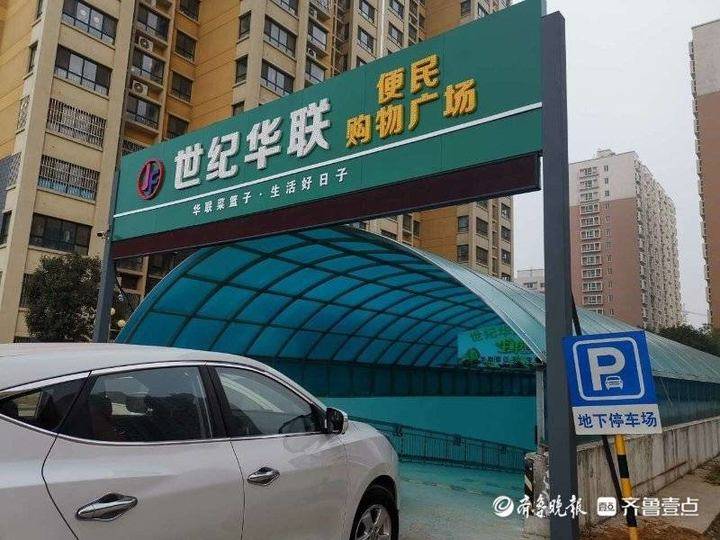 12月10日,齐鲁晚报·齐鲁壹点记者来到位于槐荫区幸福街上的琪鑫苑小区。进入小区西门,就能看到地下停车场的出入口,而入口上方就竖立着一个非常大的广告牌,上面写着“世纪华联超市便民购物广场”几个大字。沿着车行道改造成的台阶走到底,就能看到名为“世纪华联购物广场”的超市。