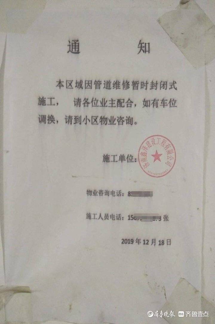 据陈女士介绍,去年12月,小区地下停车场部分区域突然拉起围挡开始施工,现场还贴了一张通知,通知上说该区域因管道维修需要暂时封闭施工,请业主配合。由于施工区域有业主购买的车位,所以受影响的业主需要到物业把车位调换到其他区域,2020年3月才能调回来。