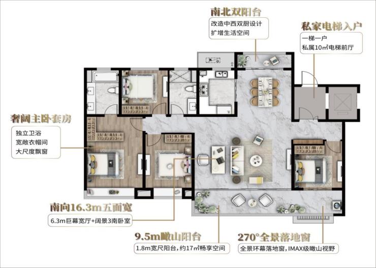 约9.5m宽尺南北双阳台,一处用来生活,一处用来耕耘诗和远方。270°环幕落地窗,无界瞰山,让无限风光自然延伸到室内。85%的超高得房率,更少公摊,更多私享!