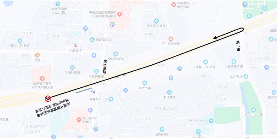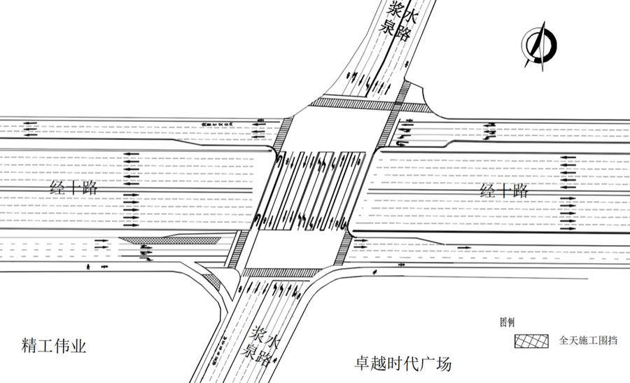 2022年1月7日22:00至2022年1月10日5:00,在经十路浆水泉路路口以西实施燃气迁改合口施工,施工占用经十路南侧辅路掉头车道及交叉口西南角右转车道,机动车道由4车道临时调整为3车道。经十路主路由西向东及燕山立交下桥匝道拟进入辅路掉头的车辆,需沿经十路主路直行至前方的洪山路路口实施掉头,经十路南侧驻地单位车辆可在辅路随左转实施掉头;由西向南右转车辆需到交叉口停止线通行;行人及非机动车正常通行。
