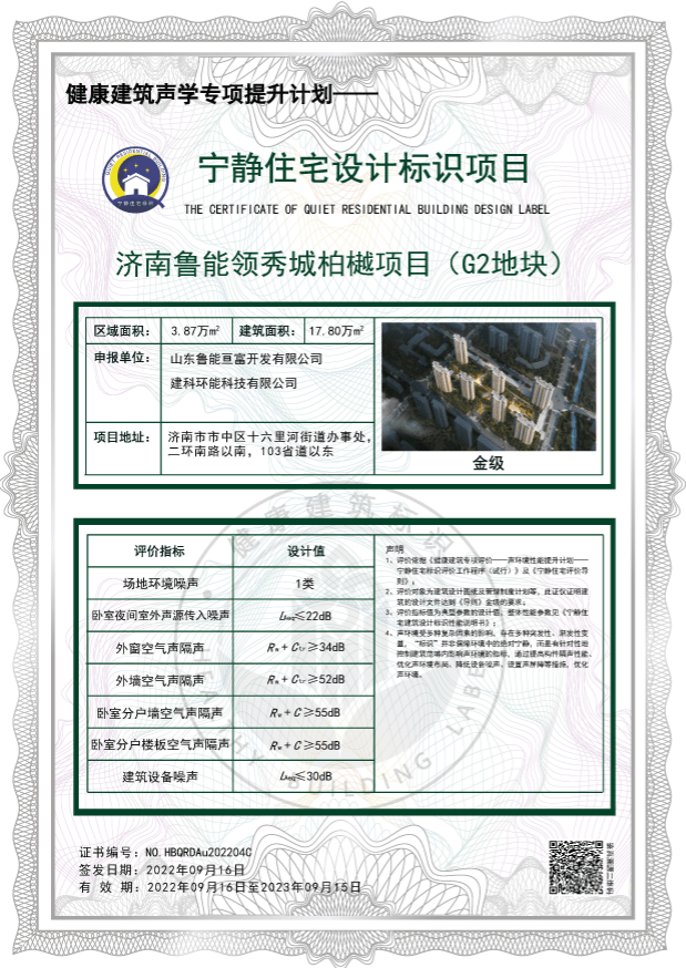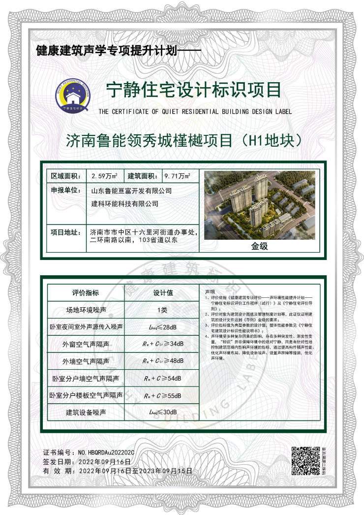 中国绿发济南领秀城樾系项目荣获全国首批次排名前列宁静住宅认证