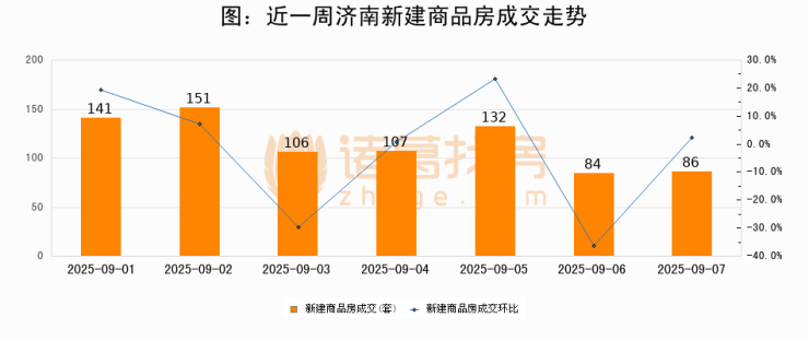 根据济南市住房和城乡建设局数据显示,2025年09月07日济南新建商品房成交86套,较昨日增加2套,环比上涨2.4%