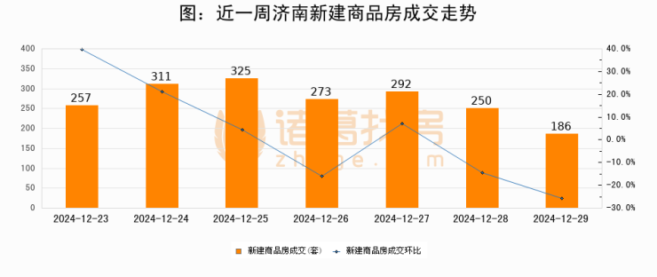 根据济南市住房和城乡建设局数据显示,2024年12月29日济南新建商品房成交186套,较昨日减少64套,环比下降25.6%