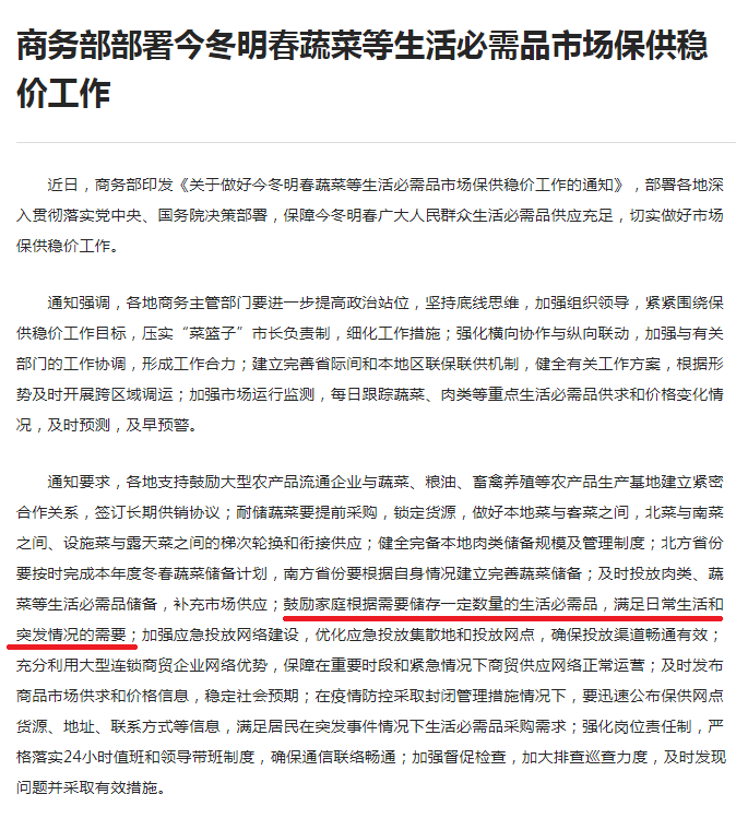 商务部近日印发的《关于做好今冬明春蔬菜等生活必需品市场保供稳价工作的通知》中提到,“鼓励家庭根据需要储存一定数量的生活必需品,满足日常生活和突发情况的需要”。一句话引出网友各种猜测,引起热切讨论。 商务部网站截图 其实,网友的密切关注可以理解,但如果因此过度脑补,累积焦虑,完全没有必要。通知的本意就