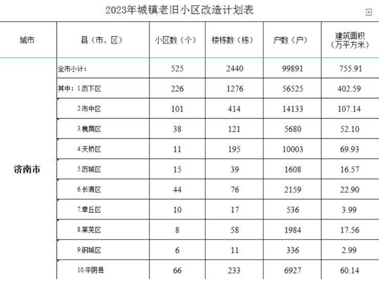 近日,山东省住房和城乡建设厅、山东省发展和改革委员会、山东省财政厅、山东省通讯管理局、山东省能源局联合发布《关于公布2023年城镇老旧小区改造计划的通知》,2023年全省共计划改造老旧小区3898个,其中涉及济南525个小区。记者注意到,历下区以226个小区位居排名前列,市中区101个小区,槐荫区38个小区,天桥区11个小区,历城区15个小区等。(山东商报·速豹新闻网记者 史尚静)