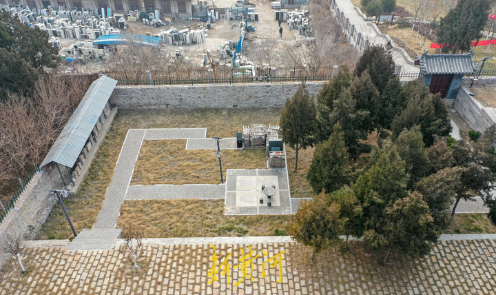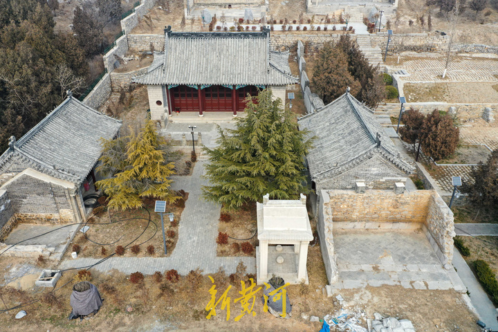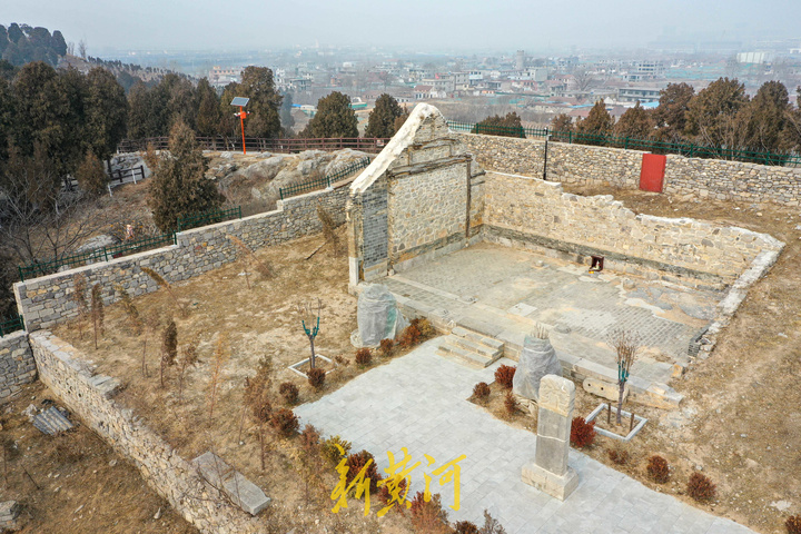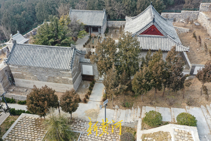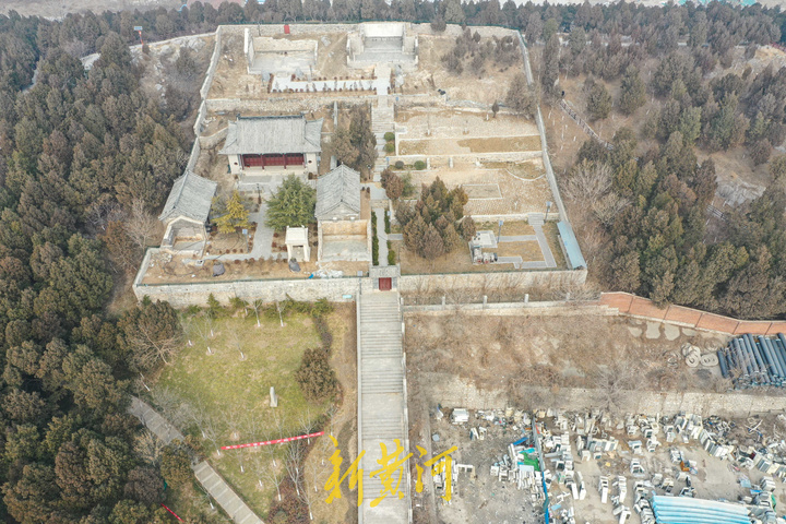 2月14日,在济南槐荫区大金庄西侧,从高空俯瞰,峨嵋山古建筑群依山势而建,分上、下两院。上院为道教建筑,东为文昌阁、西为碧霞宫。下院为佛教建筑,北部居中为三大士殿,东西建有配殿及附属建筑,南部建有钟鼓楼。