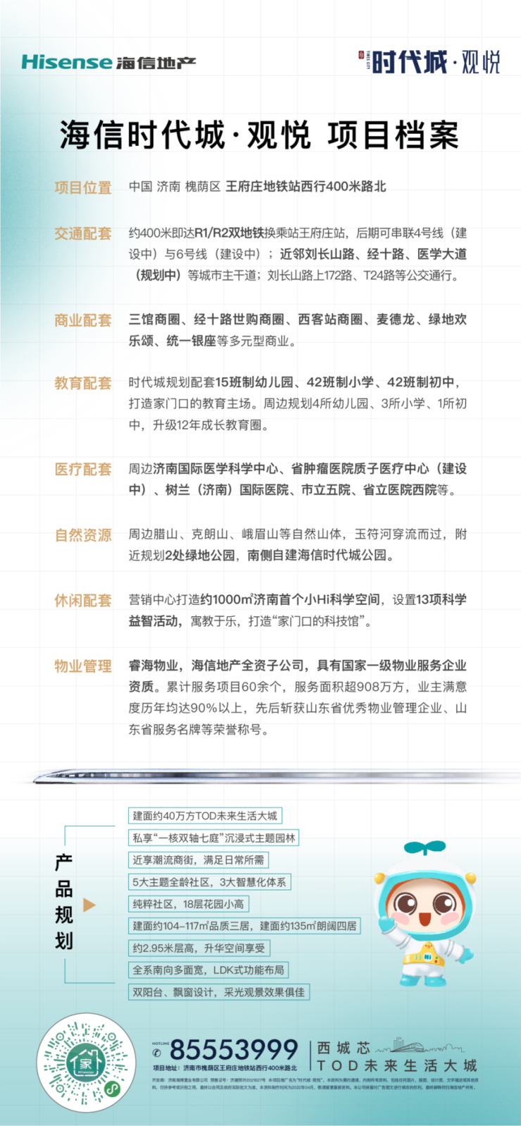 海信地产作为济南城市美好生活的共进者,已履迹泉城19载,首次布局槐荫,秉承着“有爱·建筑也动情”的理念,提前擘画时代生活蓝图,自建约9000㎡海信时代城公园,与济南排名前列小Hi科学空间、建面约40万方海信时代城·观悦,以实际行动赋能槐荫绿色生态、配套完善的宜居环境,为槐荫升级更新提供“海信力量”。