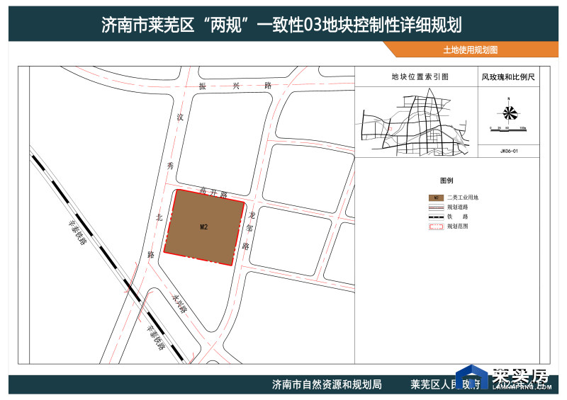 济南市莱芜区“两规”一致性06地块位于济南市莱芜区经开区嘶马河以南片区JK-20街区,芹村河以北,胜利北路以东,振兴路以南,长勺北路以西。规划总用地面积约6.08公顷。