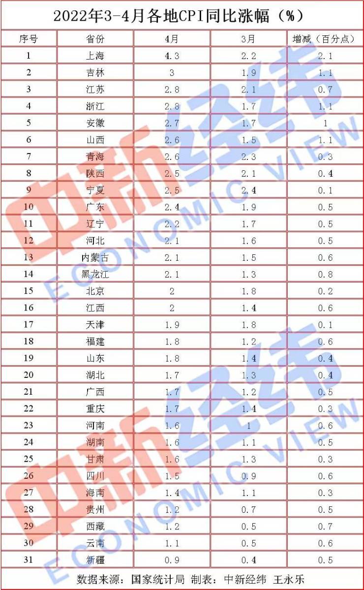 记者注意到,在4月31省份CPI涨幅排行榜中,前六省份CPI增幅均挤进前七。