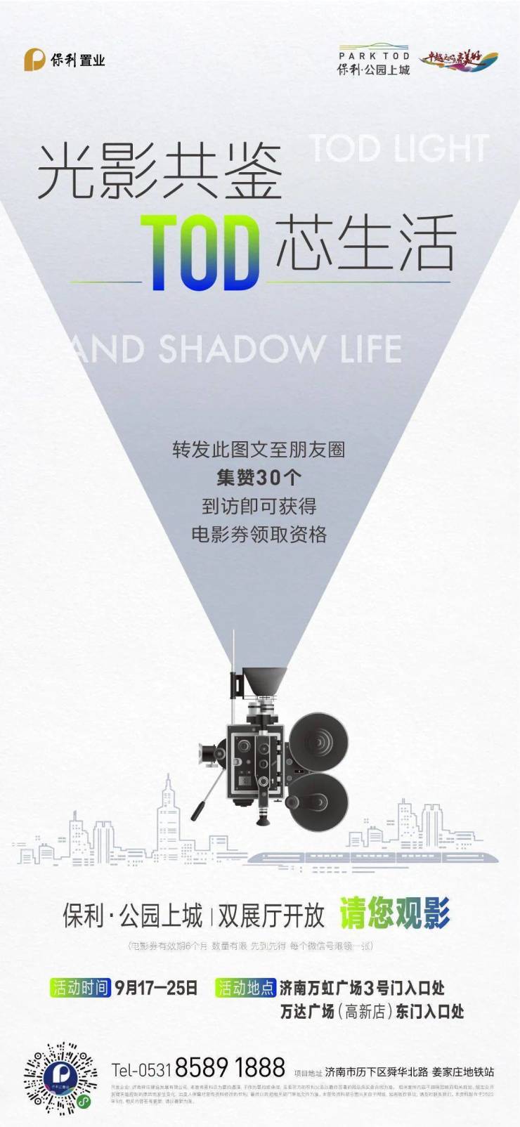 日前,保利·公园上城万虹广场城市展厅、万达城市展厅(高新店)相继开放,引发一城瞩目。为致谢全城热捧,保利·公园上城特推出“光影共鉴 TOD芯生活”集赞观影活动。9月17日—9月25日,转发此链接至朋友圈,集赞30个,即可获得电影券领取资格(数量有限 先到先得),以电影为媒介,传达致谢之心,传递生活理念。
