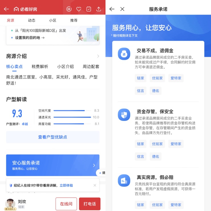 据了解,安心服务承诺在贝壳找房APP房源详情页及经纪人店铺页全部可查询,覆盖选房、看房、购房交易等全流程,形成二手房交易过程全流程保障。贝壳平台合作的新经纪品牌可根据自身服务能力进行选择承诺项,同时贝壳平台将进行准入审核、监督。