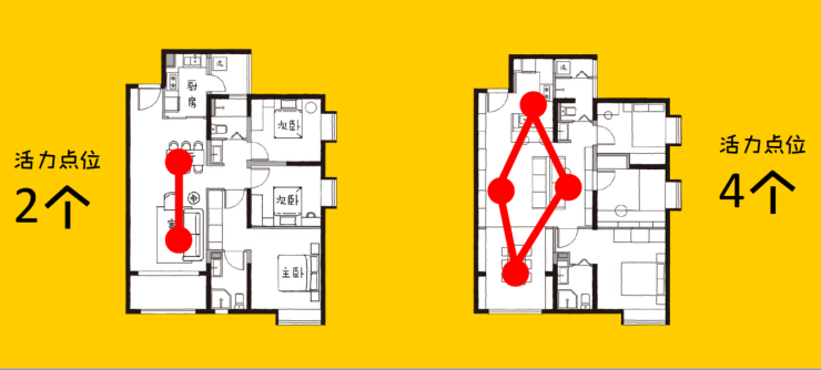 空间的打通只是显大的手段,更重要的是这种设计能够增加家人的情感交流。原本分隔在数个独立空间的家人,得以共享一个大空间,彼此的情感交流频率更高。这种设计正好契合逯薇小家布局——活力点位密码。活力点位是指在一个家的公共起居空间中,人频繁活动、经常逗留,同时与家人发生自然交流的功能区域称为活力点位,增加它,能够形成多场景、多功能、多聚点的大空间。而市中万科城在LDKB中形成的“社交五连厅”让传统户型中活力点位只有餐厅和客厅2个,提升至餐厅、客厅、书房、阳台4个,这样的布局比传统空间更有人气和活力。
