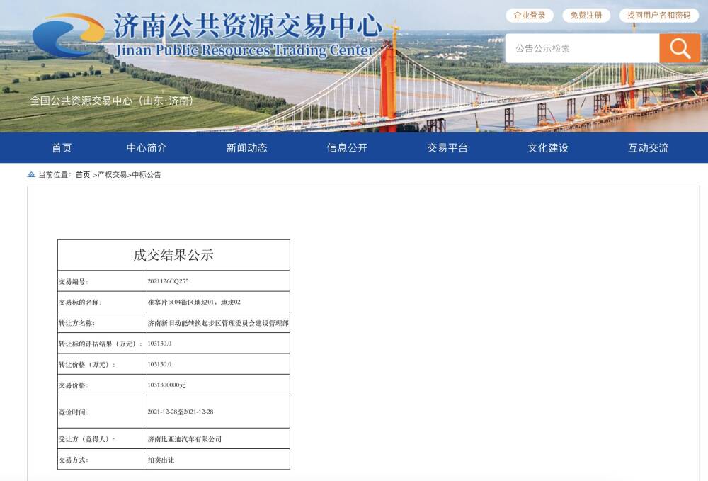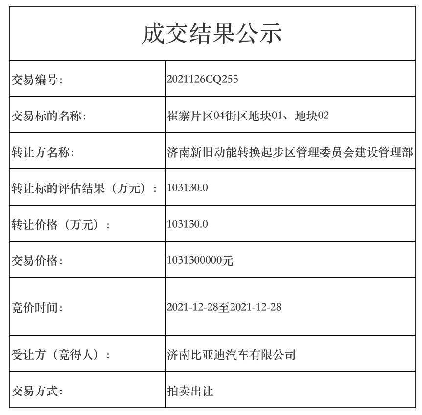 12月28日根据济南公共资源交易中心网站公示,济南新旧动能转换起步区崔寨片区两地块被济南比亚迪汽车有限公司以超过10亿的价格成功拿下。