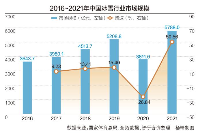2016年11月,由国家体育总局等4部门联合印发的《冰雪运动发展规划(2016~2025年)》指出,2025年要实现直接参加冰雪运动的人数超过5000万,并“带动3亿人参与冰雪运动”;2020年冰雪产业总规模达到6000亿元,2025年冰雪产业总规模达到10000亿元的目标。