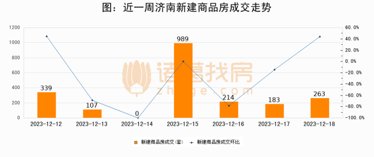 根据济南市住房和城乡建设局数据显示,2023年12月18日济南新建商品房成交263套,较昨日增加80套,环比上涨43.7%。近一周济南新建商品房日均成交300套。12月18日单日成交263套,低于近一周平均水平12.3%。