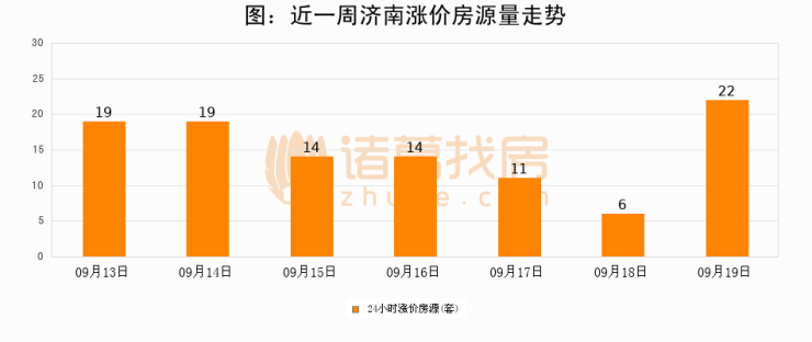 根据诸葛找房数据显示,济南24小时涨价房源量为22套,较09月18日增加16套,环比上涨266.7%。与此同时,涨价房源占比小幅扩大,业主信心有所提升。