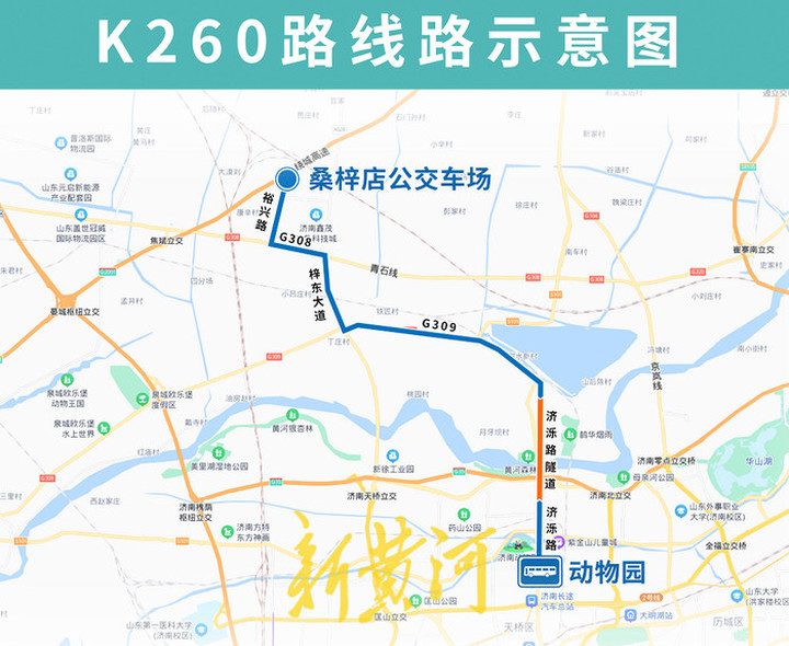 新黄河记者了解到,该线路是“万里黄河排名前列隧”通车后的首条公交线路。K260路由桑梓店公交车场开往动物园,主要途经裕兴路、308国道、梓东大道、309国道、济泺路隧道、济泺路。沿途设置桑梓店公交车场、裕兴路鑫源大道、裕兴路华泰路、大马庄村、裕兴化工、沙李村、桑梓店街道办事处西、桑梓店街道办事处南、仓上村、仓上村南、309国道梓东大道、小屯村、铁匠村、桑梓店老屯村、黄河冠世花园、王家镇村、济泺路隧道北、大坝、泺口服装城、动物园站点。