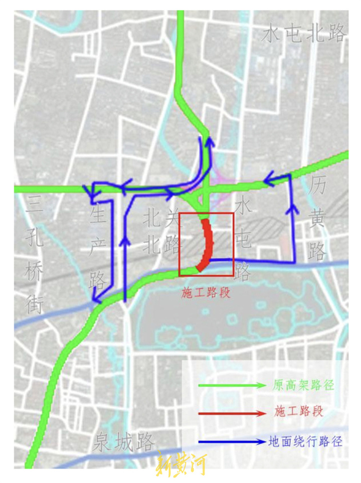 10月24日,记者了解到,顺河高架系杆拱桥2021年11月1日至2021年11月7日(时间段为0:00—4:30)进行分时段全封闭施工。 (封闭期间导行示意图) 顺河高架系杆拱桥1998年建成通车,已运行20多年,位于北园立交南侧,顺河高架路明湖北路出口与清河北路出口之间,上跨大明湖火车站西咽喉,桥