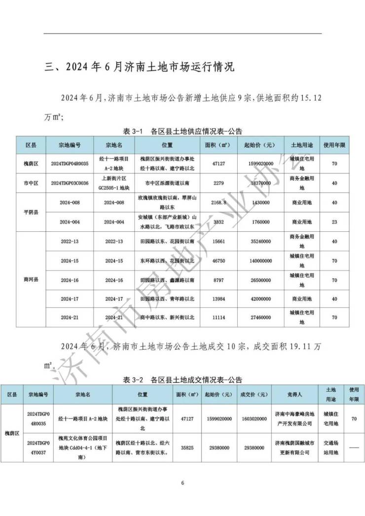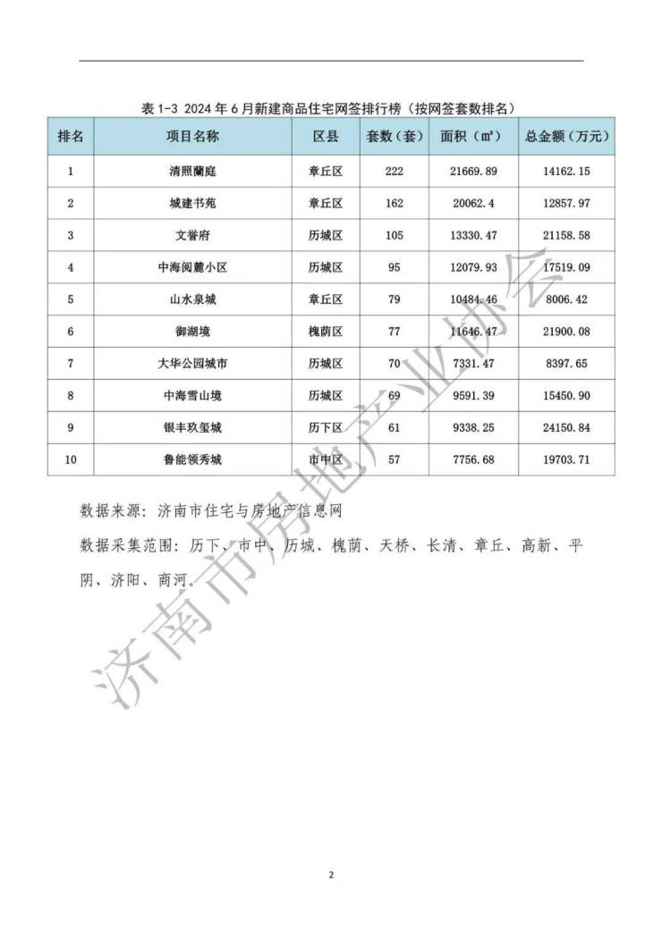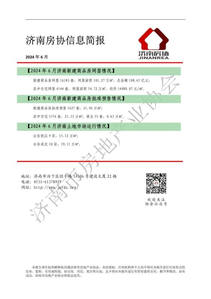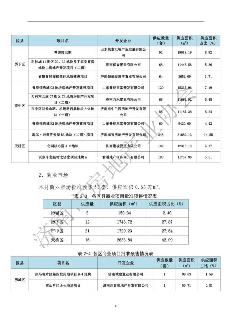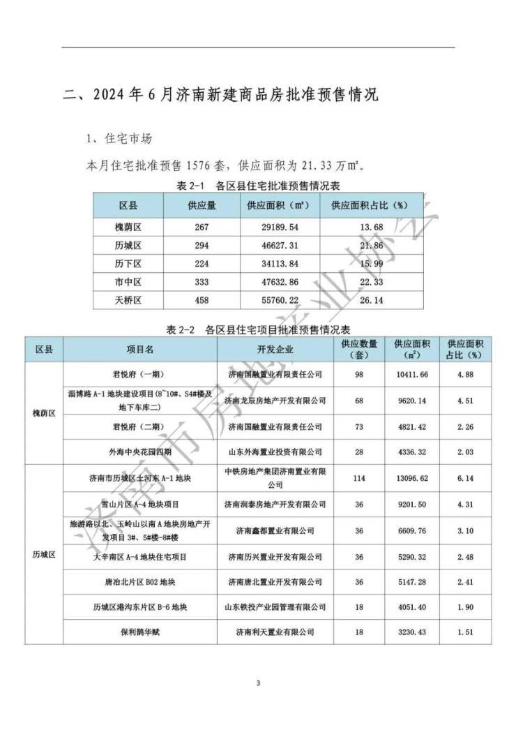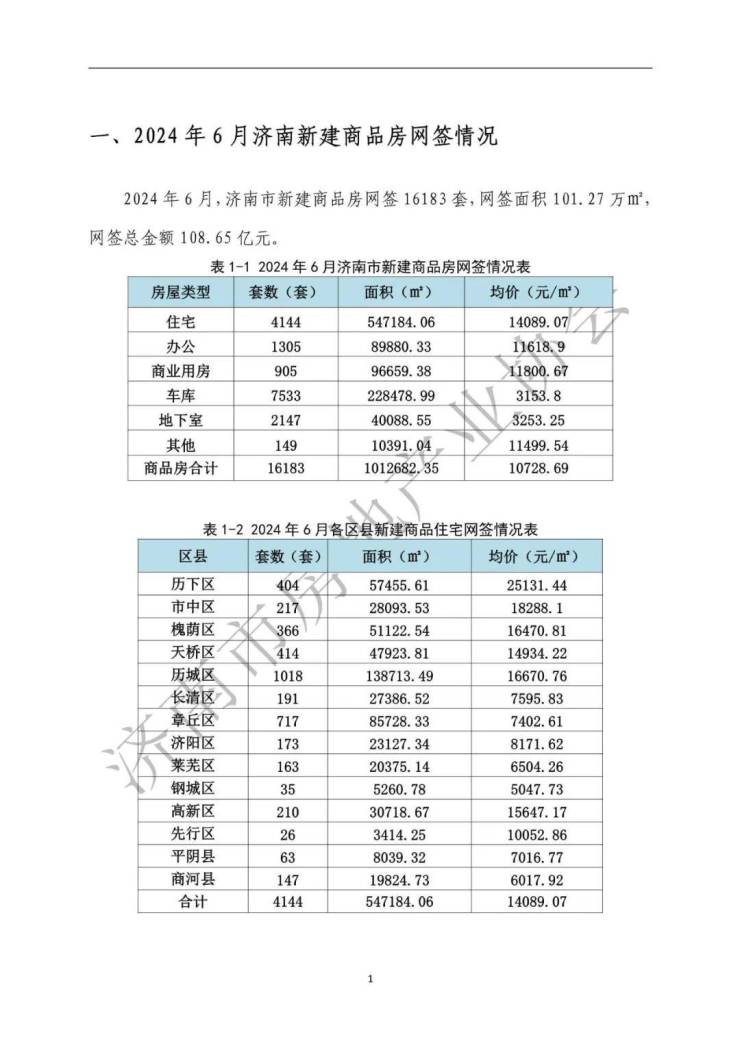 6月份济南 新建商品房网签16183 套,面积101.27万 平 , 其中住宅4144 套,面积54.72 万 平 ; 济南新建商品房批准预售1627 套,面积21.96 万 平 , 其中住宅1576 套,面积21.33 万 平。