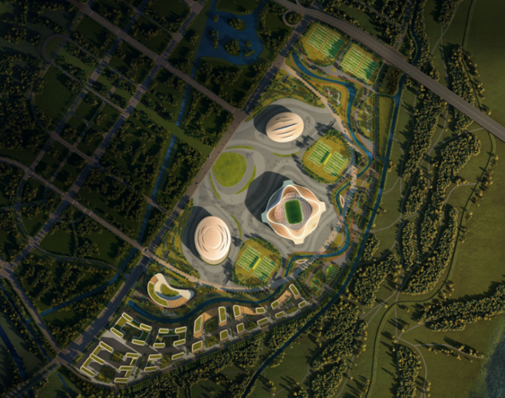 据了解,项目设计概念来源于黄河九曲,蜿蜒的水流如一条游龙,环绕着核心场馆。各类体育设施及配套服务如珍珠般点缀于水流两岸,形成一条集运动休闲、产业服务、文化体验于一体的环形体育公园景观带,同时通过城市绿廊建立核心场馆与凤凰大桥及黄河的景观联系。城市设计采用圈层式结构,南北轴心对称,从西至东串联蹴鞠广场、足球场、球迷广场、湿地公园,形成从城市到黄河,逐层开敞的空间序列,打造“一轴三环”的空间结构。