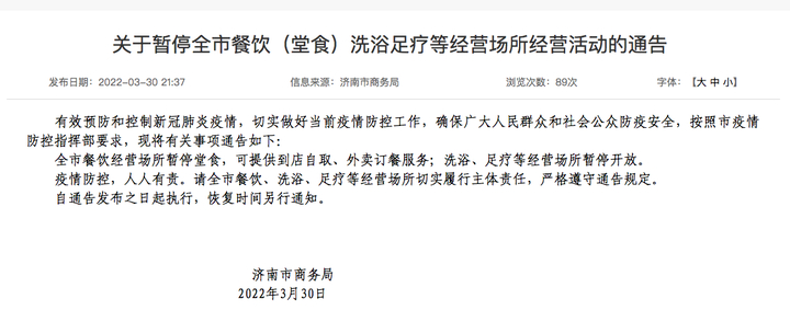济南暂停餐饮(堂食)、洗浴足疗等经营场所经营活动