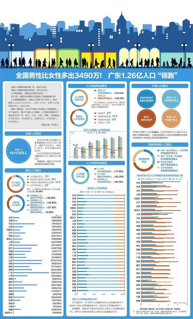 全国男性比女性多出3490万! 广东1.26亿人口“领跑”