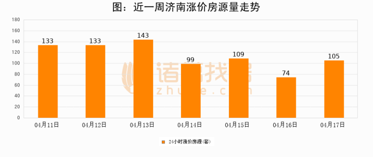 根据诸葛找房数据显示,济南24小时涨价房源量为105套,较04月16日增加31套,环比上涨41.9%。与此同时,涨价房源占比小幅扩大,业主信心有所提升。