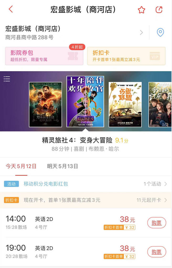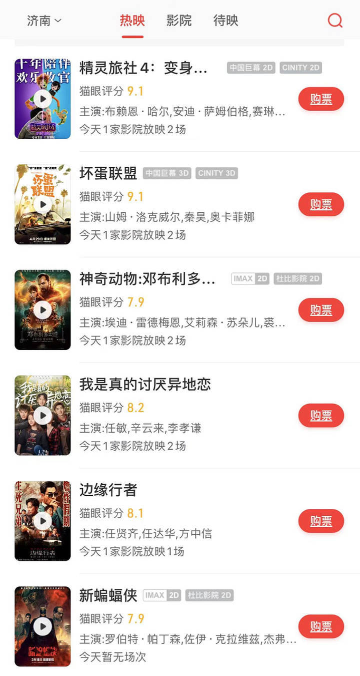 目前全国在映的影片有《精灵旅社4:变身大冒险》《坏蛋联盟》《我是真的讨厌异地恋》《边缘行者》等,商河县的宏盛影城(商河店)是济南市排名前列个排好了场次的影院,分别给这4部影片在今天下午2:00后安排了1-2场。