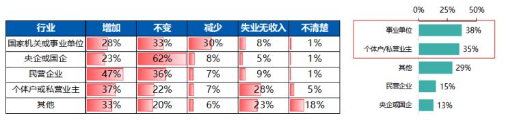 ◆ 未来收入预期仍相对较弱,制造业、交通运输、住宿餐饮行业受冲击影响较大