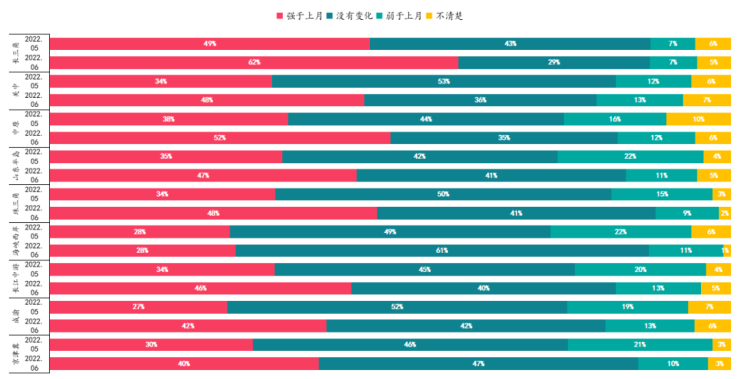图:2022年6月受访者相比上月本月购房意愿的态度变化(不同区域)