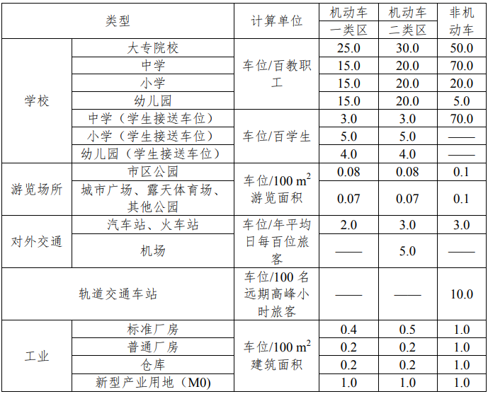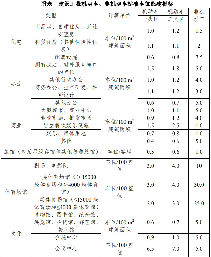 如,在一类区域内,商品房、自建住房、拆迁安置房建设工程按每100平方米为单位配建停车位,一、二类区域内停车位配建比例为1:1.0~1.2。为支持租赁住房等其他保障性住房建设,一、二类区域内停车位配建比例均为1:1.1。需要指出的是,户均建筑面积低于100平方米/户的,一类区域机动车停车位按照1.0车位/户,二类区域为1.2车位/户进行计算,取高值作为配建指标;一类区域户均建筑面积超过200平方米/户、二类区域户均建筑面积超过167平方米/户的,机动车停车位按照2.0车位/户进行计算。