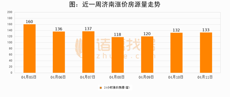 根据诸葛找房数据显示,济南24小时涨价房源量为133套,较04月10日增加1套,环比上涨0.8%。与此同时,涨价房源占比小幅扩大,业主信心有所提升。