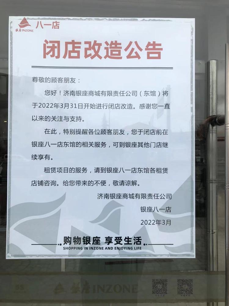 3月21日,记者在银座八一店看到,该商场的入口处已经张贴了相关公告,公告称济南银座商城有限责任公司将于2022年3月31日开始进行闭店改造,并特别提醒各位顾客:于闭店前在银座八一店东馆的相关服务,可到银座其他门店继续享有。