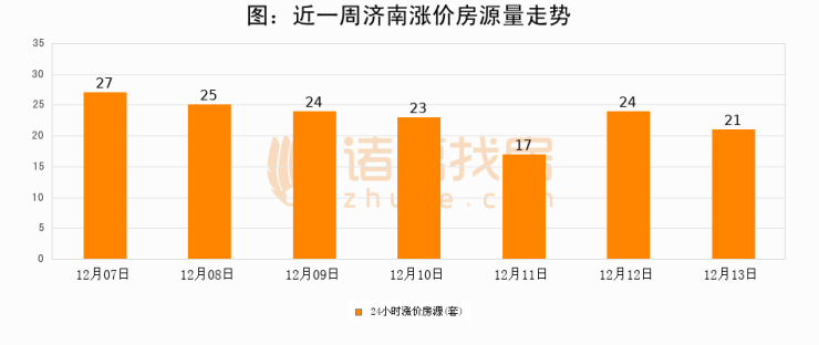 根据诸葛找房数据显示,济南24小时涨价房源量为21套,较12月12日减少3套,环比下降12.5%。与此同时,涨价房源占比小幅回落,对于购房者来说是一个入市窗口期,购房者可抓住时机入市。