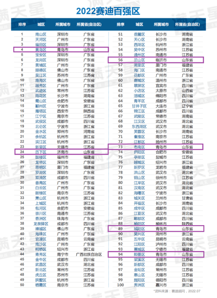 记者梳理榜单看到,山东上榜城区数量为6个。具体到城市来说,青岛、济南、临沂分别上榜4个、1个、1个城区。