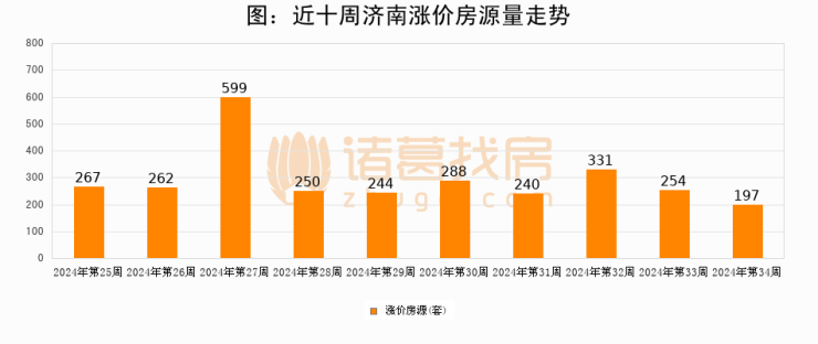 从调价房源来看,第34周济南涨价房源197套,较上周下降22.4%。与此同时,34周涨价房源占比回落0.01个百分点,业主信心小幅波动,购房者可则需入市。