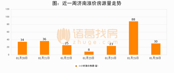 根据诸葛找房数据显示,济南24小时涨价房源量为30套,较01月25日减少58套,环比下降65.9%。与此同时,涨价房源占比小幅回落,对于购房者来说是一个入市窗口期,购房者可抓住时机入市。