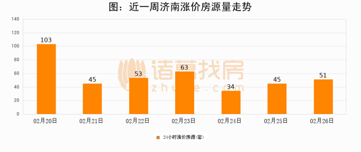 根据诸葛找房数据显示,济南24小时涨价房源量为51套,较02月25日增加6套,环比上涨13.3%。与此同时,涨价房源占比小幅扩大,业主信心有所提升。