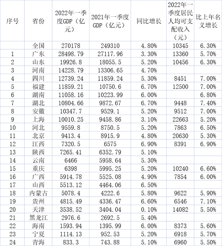 国家统计局4月18日公布了全国一季度主要经济数据之后,截至目前,已有24省份公布了当地的一季度经济运行情况。