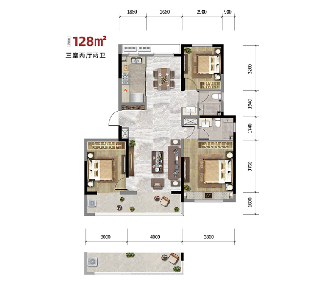 建面约128㎡敞阔三室,满足你的小情趣