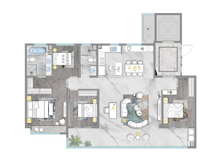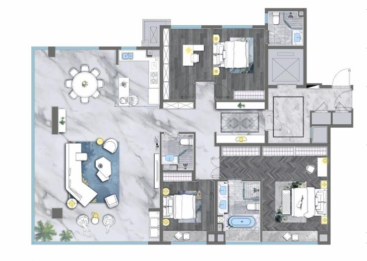 龙湖推出的又一四面宽大阳台户型,阳台宽度达到创纪录的11米,可以称得上是150平米以内户型的先进之作,该户型还拥有超过13米的南向观景面宽,总统套房般的主卧,面积达到24㎡。