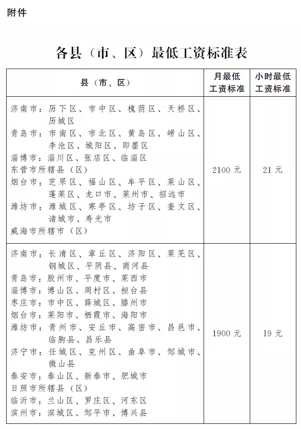 山东省人民政府根据我省经济社会发展和职工工资水平增长等情况,经人力资源社会保障部审核,确定调整较低工资标准。济南各区较低工资标准如下: