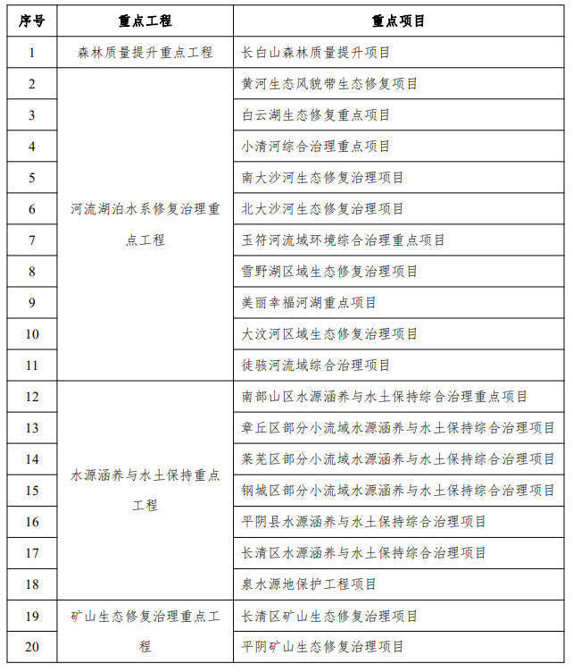 基于国土空间生态修复格局,针对主要生态环境问题,聚焦生态修复重点区域,《生态修复规划》部署六大类生态修复重点工程,黄河生态风貌带生态修复项目、雪野湖区域生态修复治理项目等24个重点项目,整体保护、系统修复、综合治理解决区域突出生态问题、恢复受损生态系统功能、改善生态系统质量、增强生态碳汇能力,充分发挥国土空间生态保护修复工程综合效益。