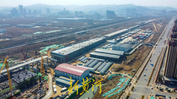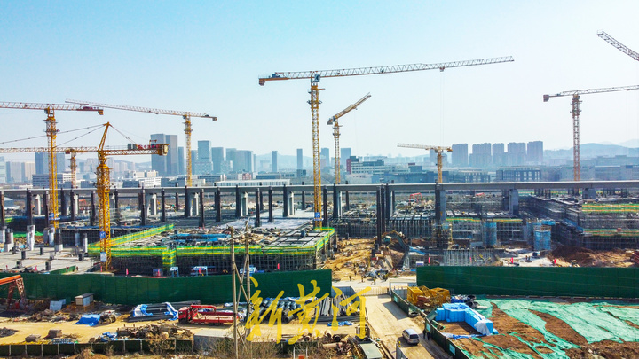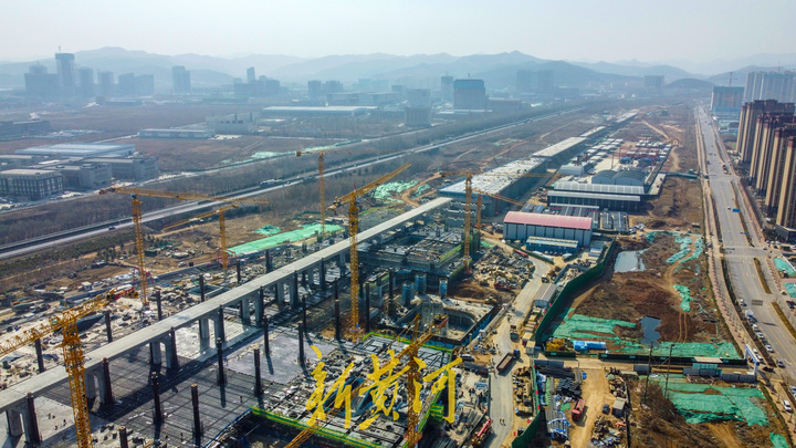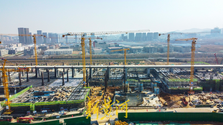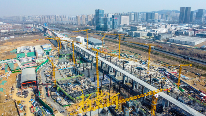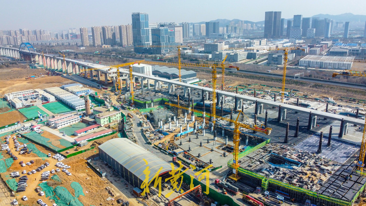 3月3日,在凤集路与永乐街交叉口的东侧,济莱高铁项目中的港沟站已经进入地上设施建设阶段,从高空俯瞰,施工现场竖立起多个塔吊,在高架箱梁的东西两侧同时建设,目前正在进行两个下沉广场主体结构、部分区域框柱和主体结构楼板施工。
