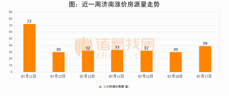 根据诸葛找房数据显示,济南24小时涨价房源量为39套,较07月16日增加9套,环比上涨30%。与此同时,涨价房源占比小幅扩大,业主信心有所提升。