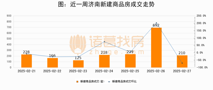 根据济南市住房和城乡建设局数据显示,2025年02月27日济南新建商品房成交210套,较昨日减少482套,环比下降69.7%。近一周济南新建商品房日均成交267套。02月27日单日成交210套,低于近一周平均水平21.3%。