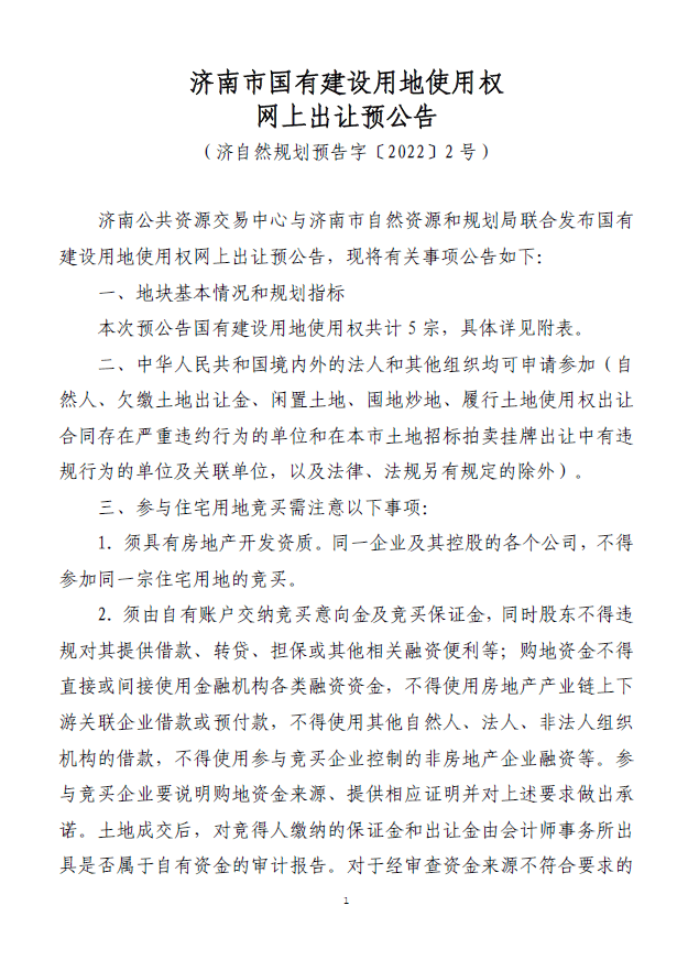 济南市国有建设用地使用权网上出让预公告(济自然规划预告字〔2022〕2号)内容如下
