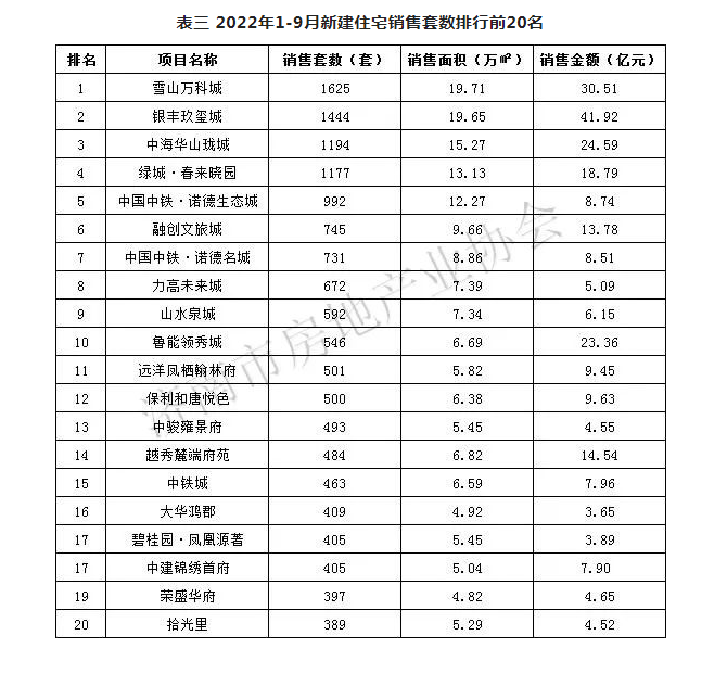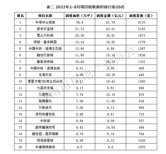 济南市房地产业协会同时还发布了济南市前三季度前20名的企业销售金额、项目销售面积和新建住宅销售套数排行榜。其中,销售金额排名前三分别为龙湖、银丰和绿地;项目销售面积前三分别为中海华山珑城、银丰玖玺城和雪山万科城。