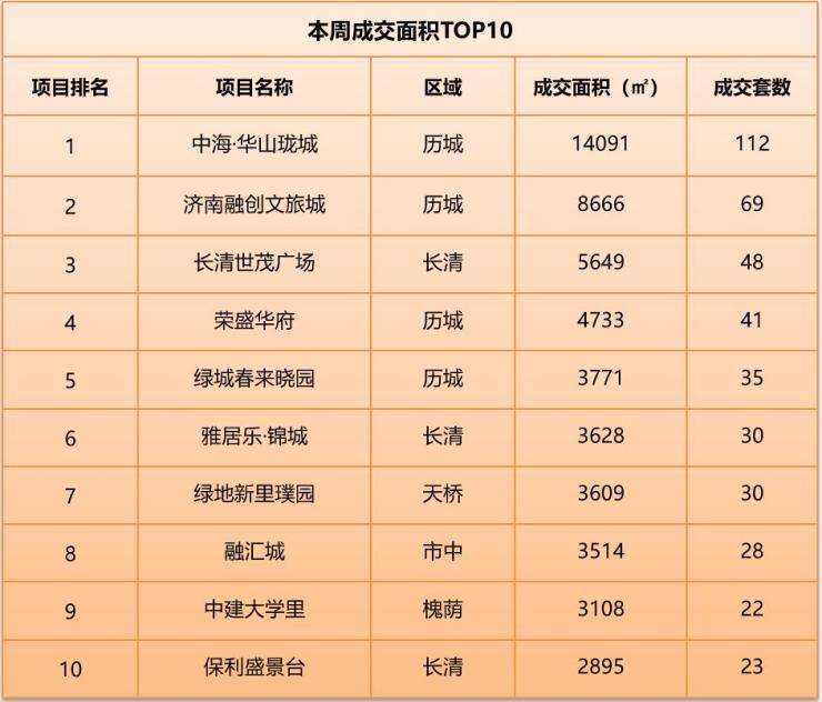 11月1日—11月7日,济南商品住宅签约面积TOP10,中海·华山珑城、济南融创文旅城分别位于榜单的排名前列、第二名。