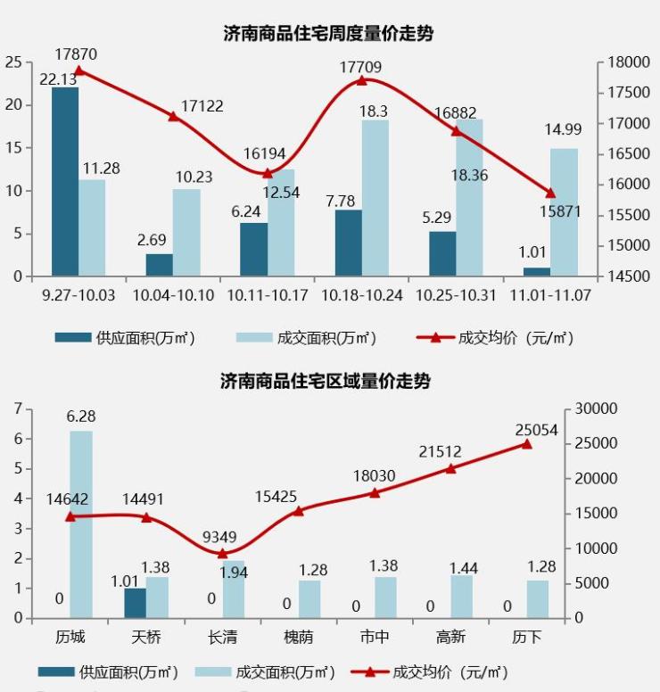 11月1日—11月7日,济南商品住宅市场新增供应1.01万㎡;成交面积14.99万㎡,环比下降18.38%,成交均价15871元/㎡,环比下降5.99%;主力成交项目为中海·华山珑城、济南融创文旅城等;本周历城区为主力成交区域。